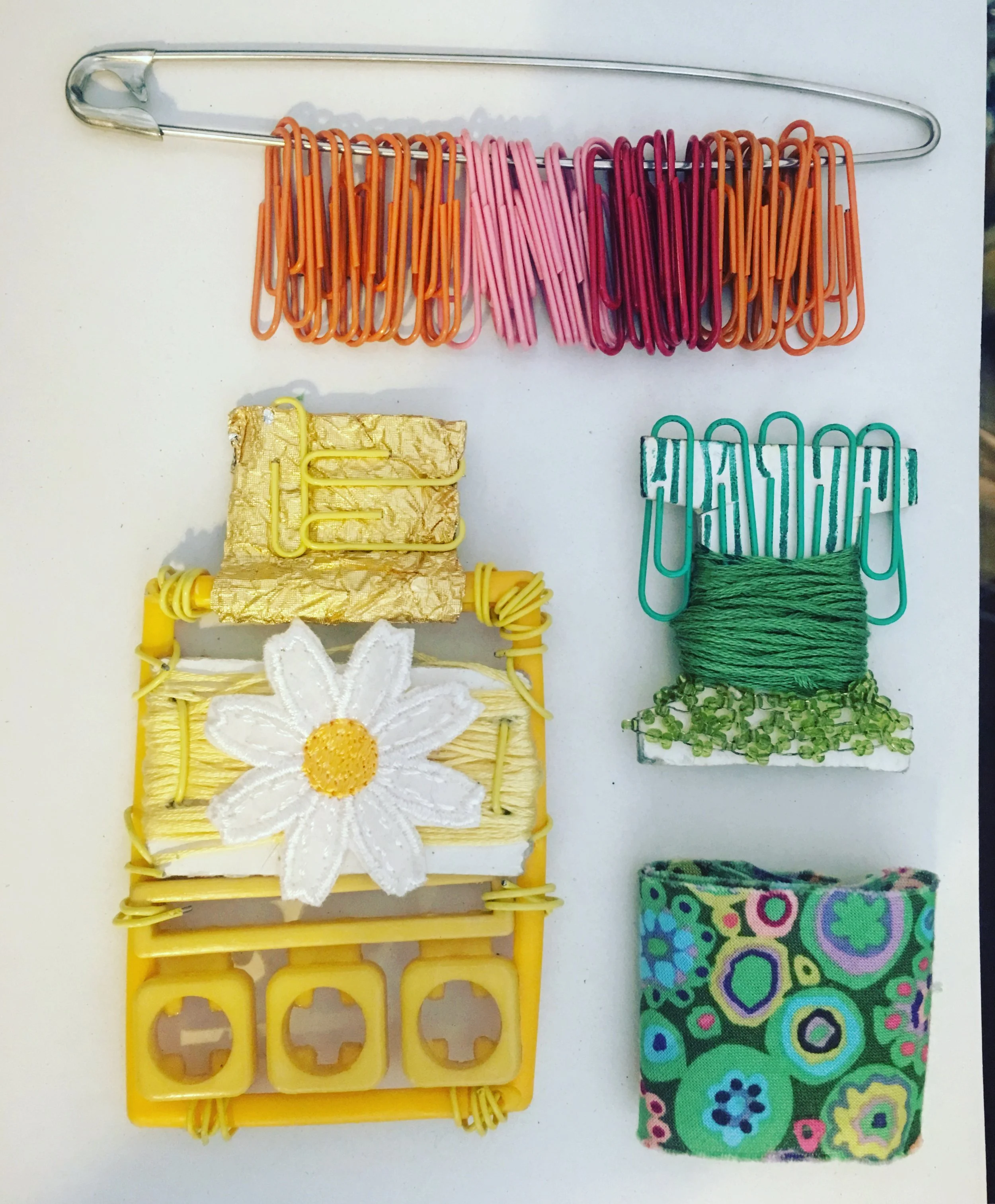 Cardboard and found object brooches