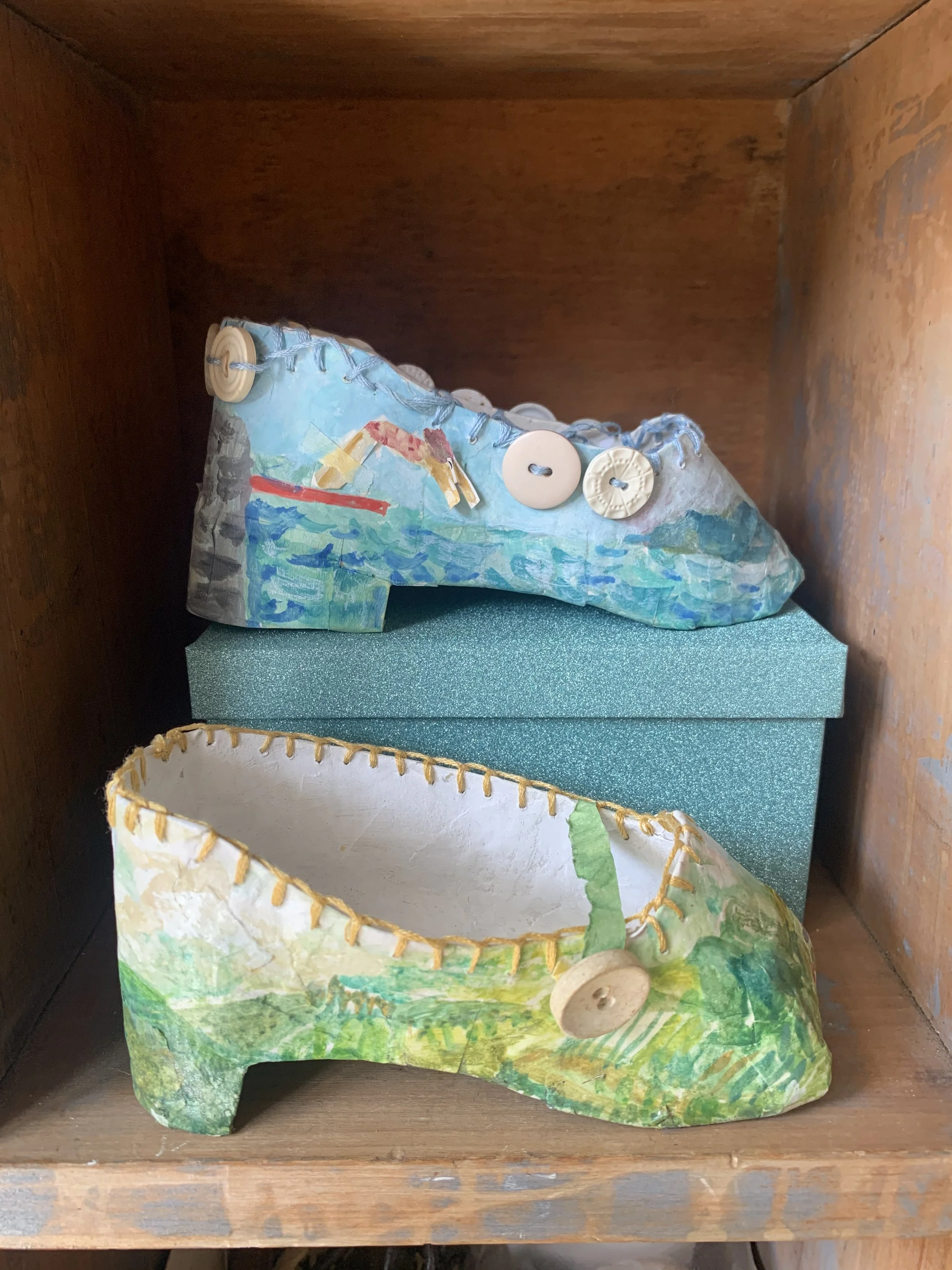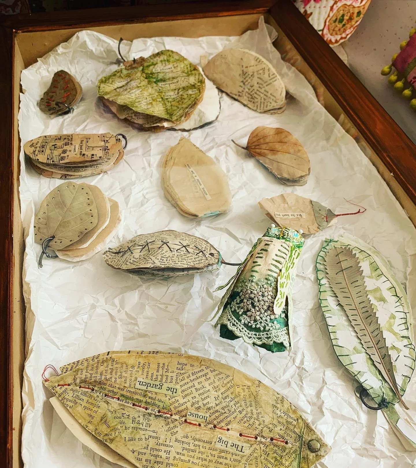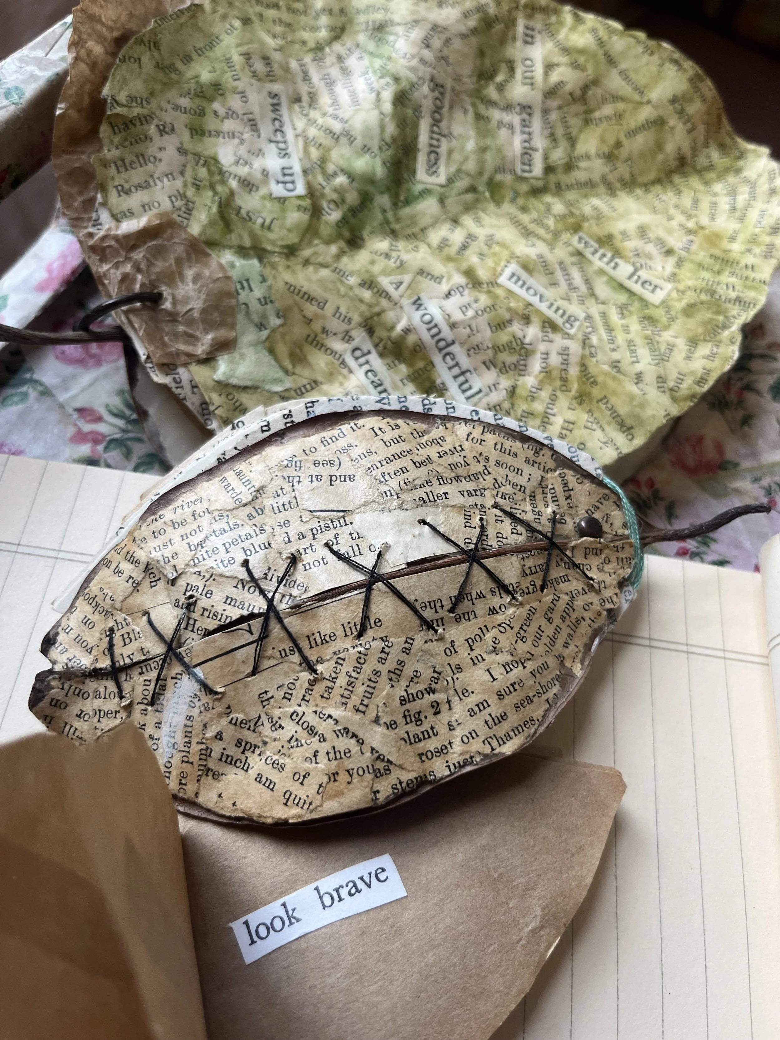 I have made small-scale artworks since childhood. Making things - especially small or tiny things, gives me Gulliver-sized pleasure. Though I work mostly in paper/paper-mache and paper clay, I also love creating junk jewellery, upcycled cloth dolls and painting on all manner of surfaces. Over the years I have had crushes on making series of items such as ‘paper shoes’, ‘cicadas’ and little ‘leaf books’. Little books are one of my great passions..
